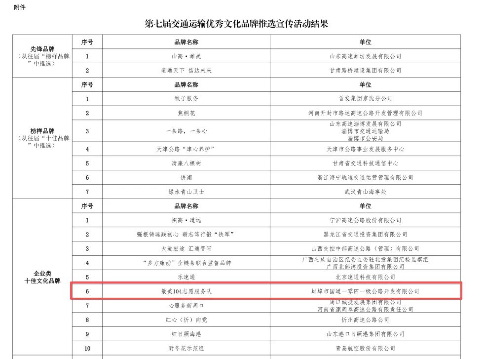 近日,由中国交通报社主办的“交通强国品牌力量”第七届交通运输优秀文化品牌推选宣传活动终评落下帷幕。在全国648个参赛品牌的激烈角逐中,国道104公司“最美104志愿服务队”凭借深厚的文化积淀、鲜明的品牌特质与亮眼的行业实践,从一众大型集团、高速企业中脱颖而出,成功斩获全国企业类“十佳文化品牌”荣誉称号,以国省干线运营企业的独特姿态,在全国交通运输文化品牌舞台上绽放璀璨光芒。