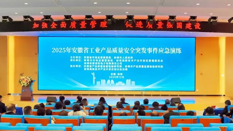 近日,2025年安徽省工业产品质量安全突发事件应急演练在蚌埠市圆满落幕。安徽省市场监管局二级巡视员王琛出席并作点评,蚌埠市人民政府副秘书长高建宇受乌兰其其格副市长委托出席并致辞,蚌埠市市场监管局、蚌埠高新区管委会相关负责同志协同保障,演练通过全程视频展播形式高效开展。