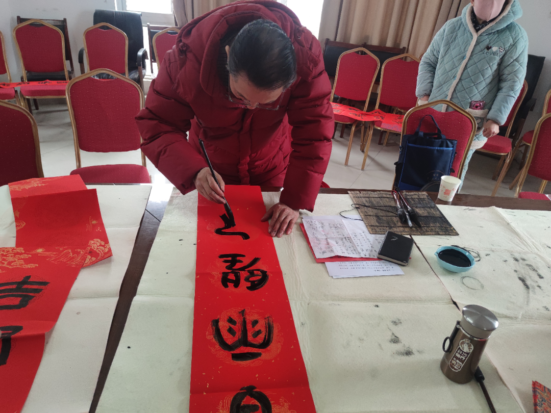 活动现场墨香氤氲、红纸翻飞,热闹非凡。老干部们铺纸研墨、挥毫泼墨,落笔间行云流水,一幅幅寓意吉祥的春联,一个个饱满圆润的“福”字跃然纸上。居民们或驻足观赏,或轻声品读,不时发出阵阵赞叹,纷纷挑选心仪的春联和福字,脸上洋溢着幸福的笑容。