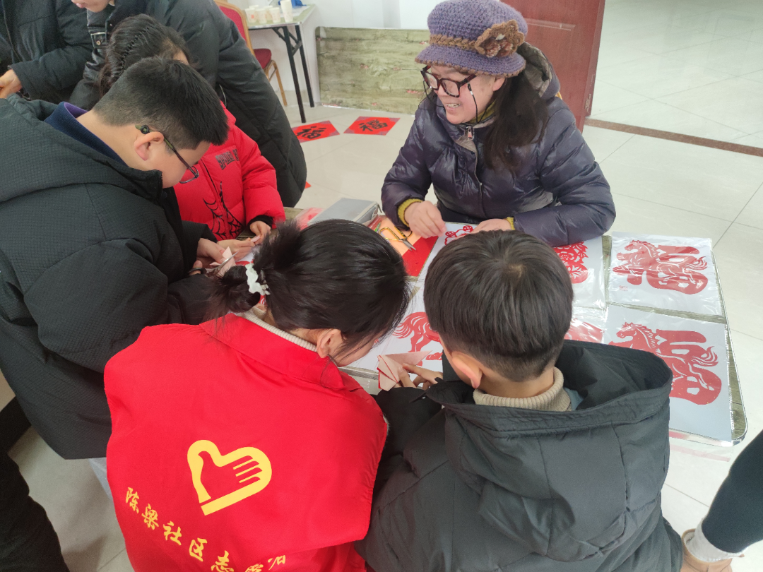 另一边的剪纸区域同样人气满满,老干部剪纸达人现场展示技艺,红纸在指尖折叠翻转,剪刀上下翻飞,寥寥数剪,栩栩如生的骏马、吉祥的窗花、喜庆的春字便悄然成型。老师们还耐心地为居民讲解剪纸技巧,从折纸方法到剪刻要点,手把手指导大家动手创作。大人小孩围坐一堂,相互展示成果、交流心得,现场欢声笑语不断,暖意融融。